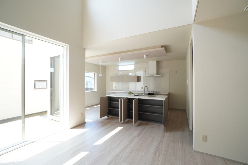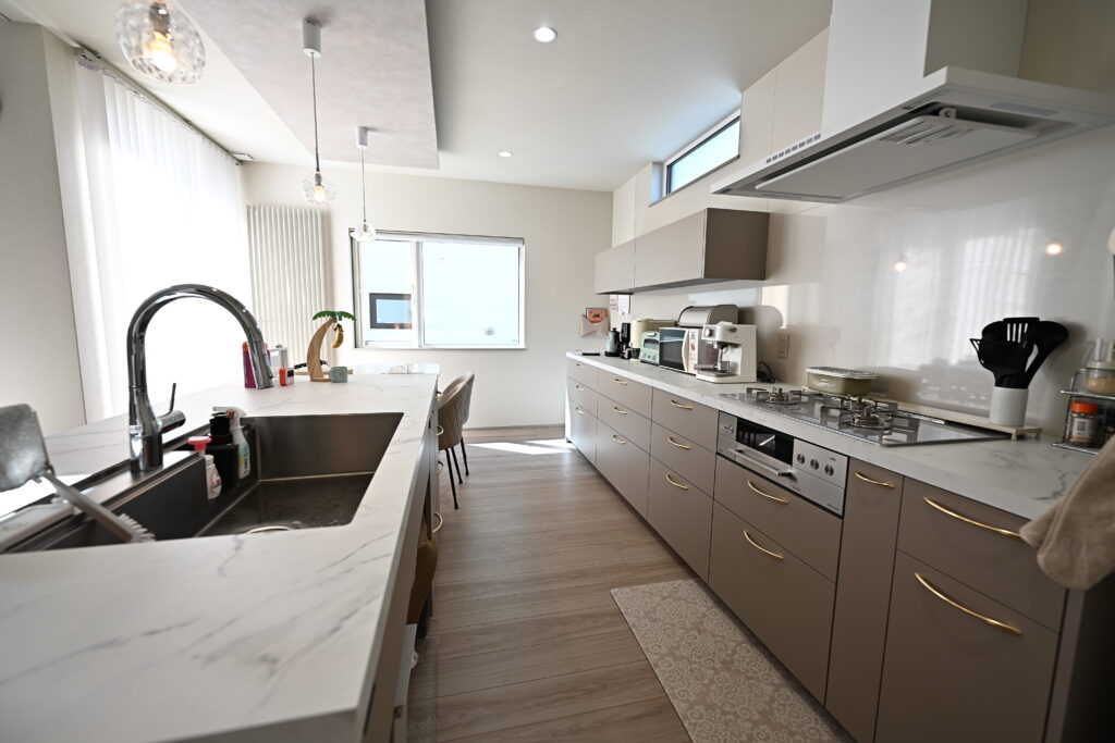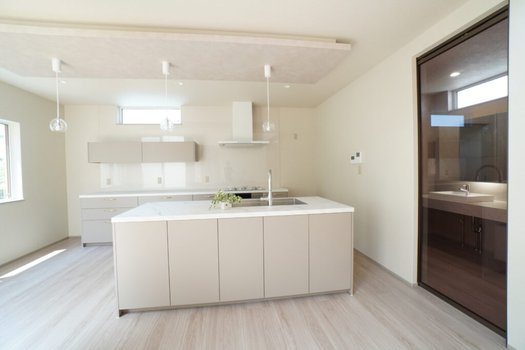 住まいるハウジングさんを知ったのは、売りにでてた土地からでした。そしてショールームを見せてもらったらキッチンに一目惚れして、ここに決めました。土地は立地がよくて選んだんですけど、57坪と少し小さめでした。それでも狭さを感じさせない間取りとデザインを提案してくれました。建てる前に何度か土地を見に行ったんですけど、「図面で見ると十分な広さだけど本当にここに建つのかな」と不思議な気持ちでした。