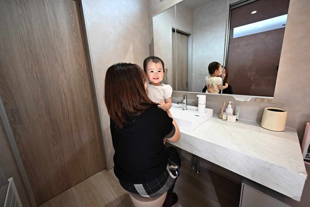ミラタップの大きな洗面カウンターと大きな鏡を選びました。コーディネーターさんの提案で箱型の収納を横につけたんですが、色もかわいいしたくさん収納できて便利です。