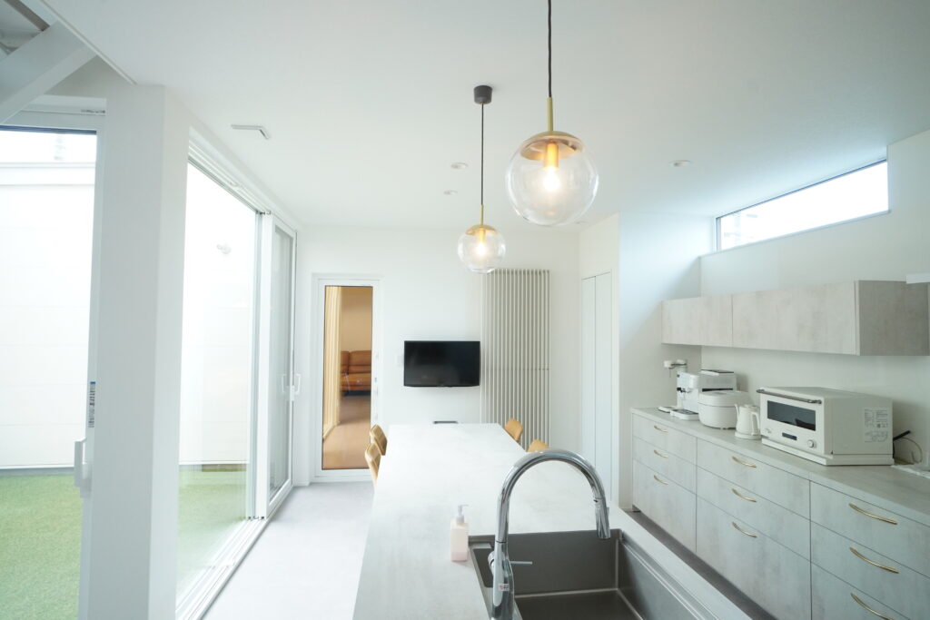 白を基調とし、高級感漂うアイランドキッチンが主役の海外風なお家です。