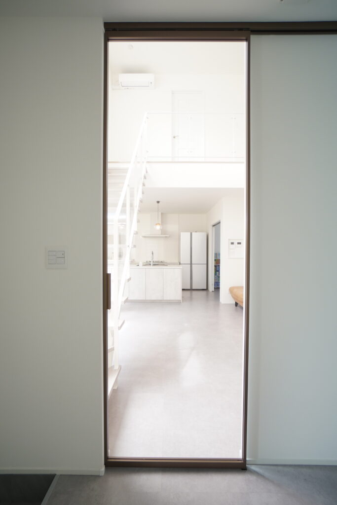 LDKの中心には、軽やかでデザイン性の高い鉄骨階段を配置。上階へと続く美しいラインが、空間にアクセントを加えます。