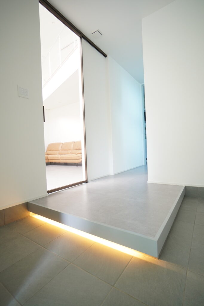 ガレージから玄関へとつながるゆとりのあるポーチは、荷物の運び込みもスムーズです。さらに、キッチンからガレージへ直接出られる勝手口を設けることで、買い物帰りの重い荷物をすぐに運び込める便利な動線を実現しました。