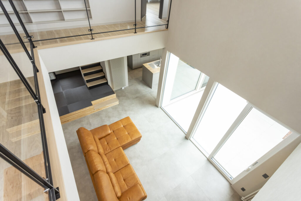 さらに、家の中央には広い吹き抜けが広がり、上下階の繋がりを感じさせます。どこにいても家族の気配を感じられる設計は、自然と会話が生まれ、絆を深めます。そして、その吹き抜けに架かるキャットウォークは、お子様の遊び心をくすぐる特別な場所。家中に好奇心を巡らせ、新しい発見が生まれる、まさに「秘密基地」のような空間です。