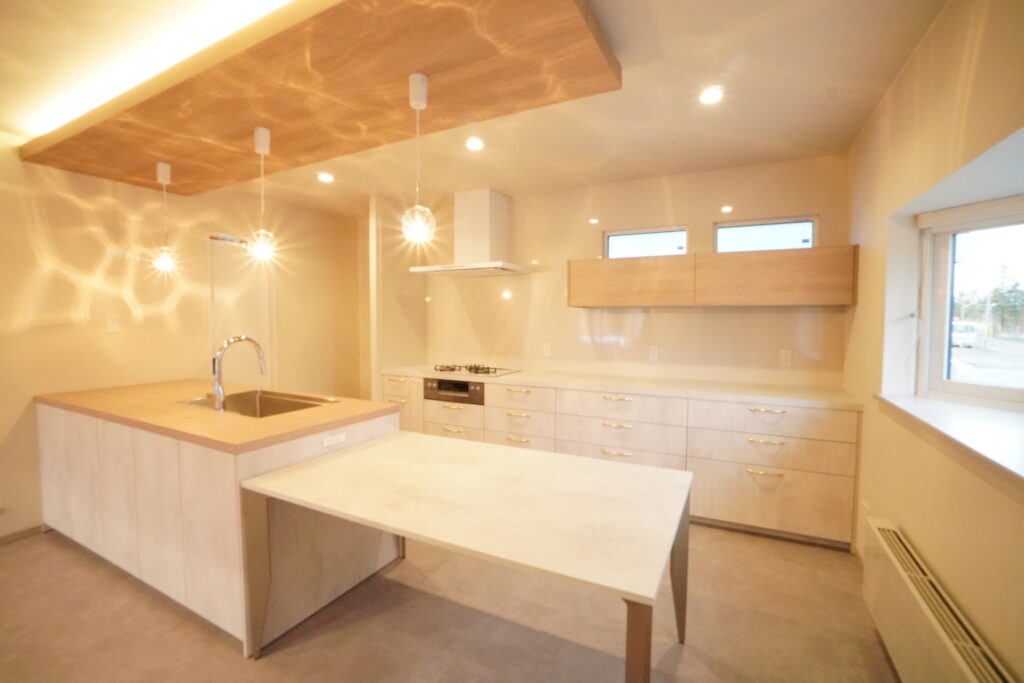 キッチンは、オープンハウスで一目惚れして頂いた、キッチンハウスグラフテクトを採用。間接照明とペンダントがアクセントになっています。